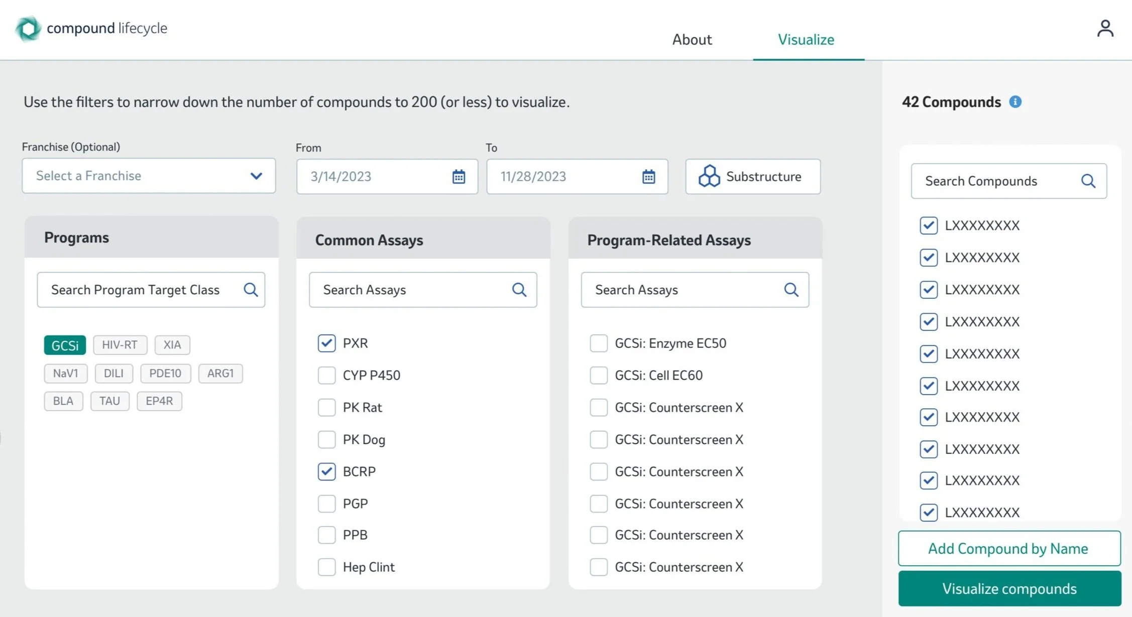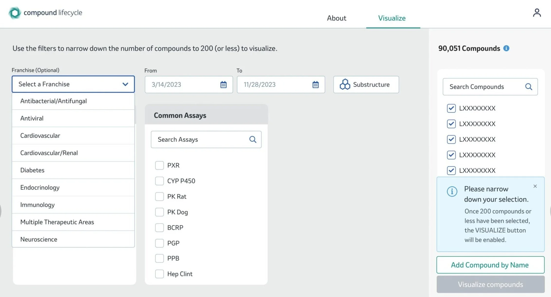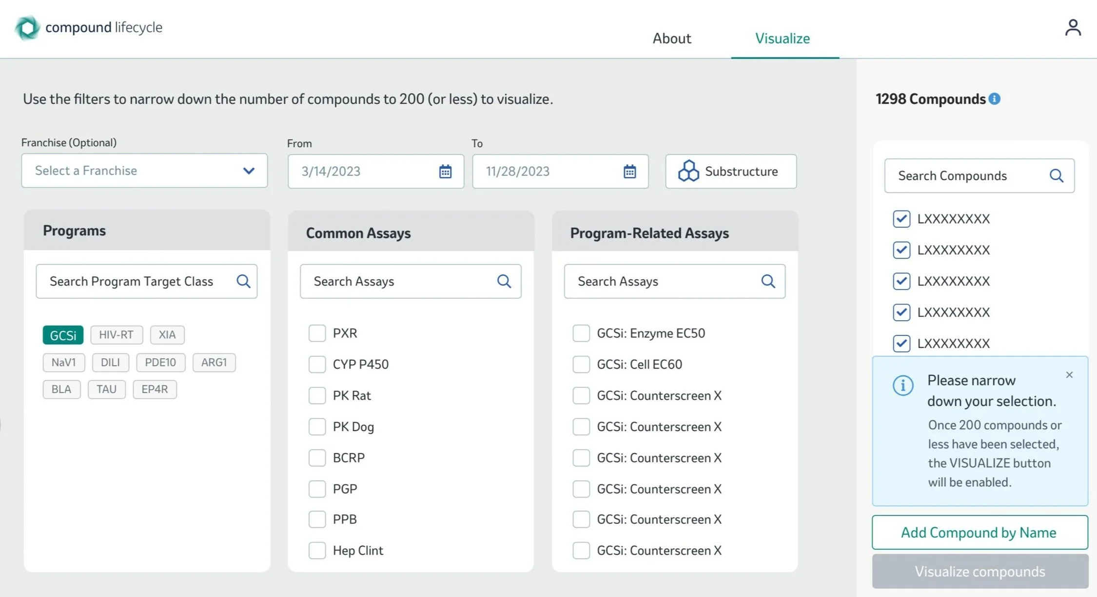 I fine tuned these mock-ups and came up with the finalized user flow. This is where the user starts. Then user selects visualize mode. Choses from the drop down menu which franchise to explore. Decides on GCSI Target Class, which prompts the software to let the user know to please narrow down the selection to 200 compounds. So the user picks PXR and BCRP assays and clicks on visualize compounds. This renders the visualization with the needed compounds. Users decides to click on compound L-000L. And choses to view the solubility assay to compare the compounds against each other as last step.