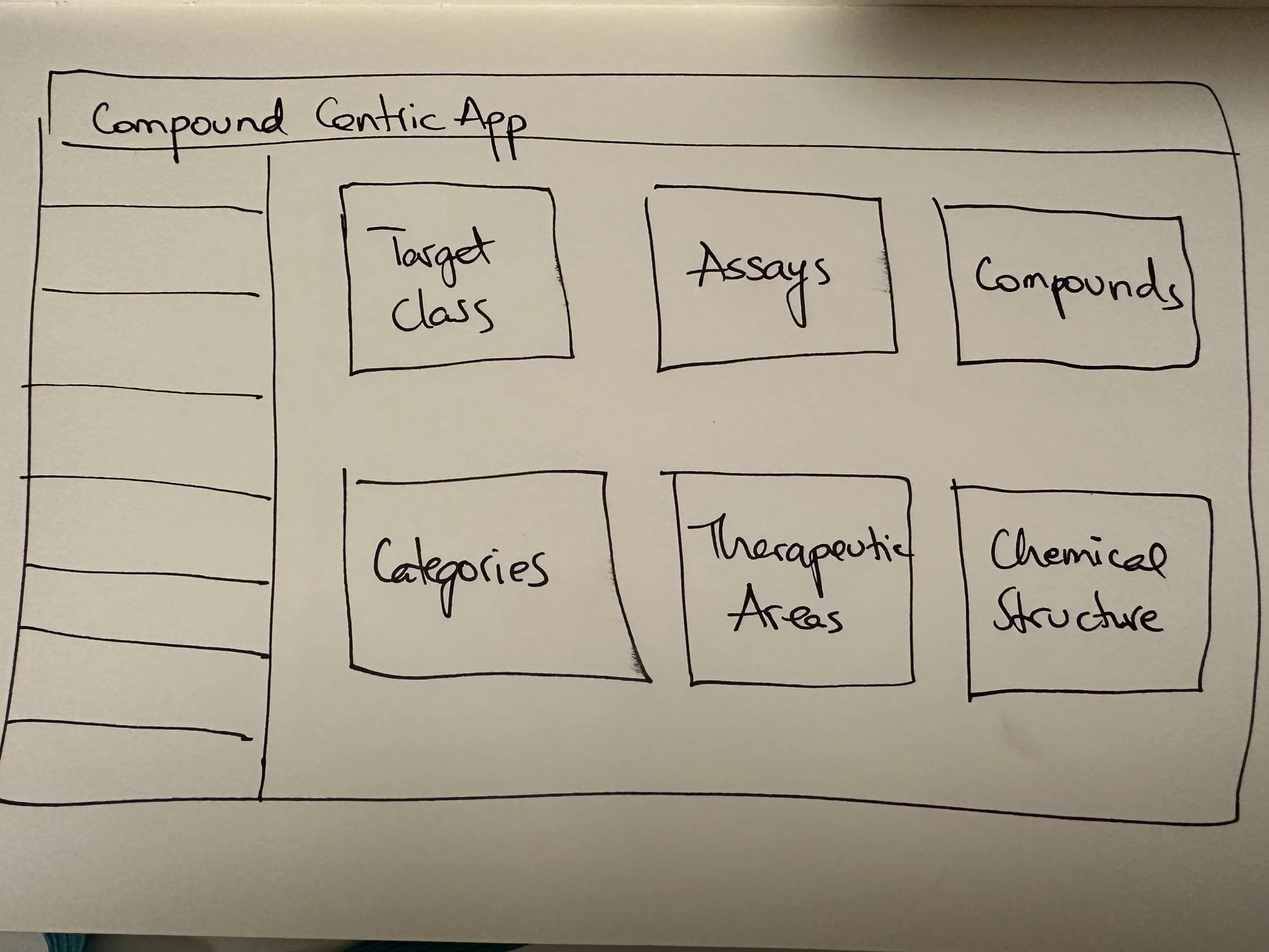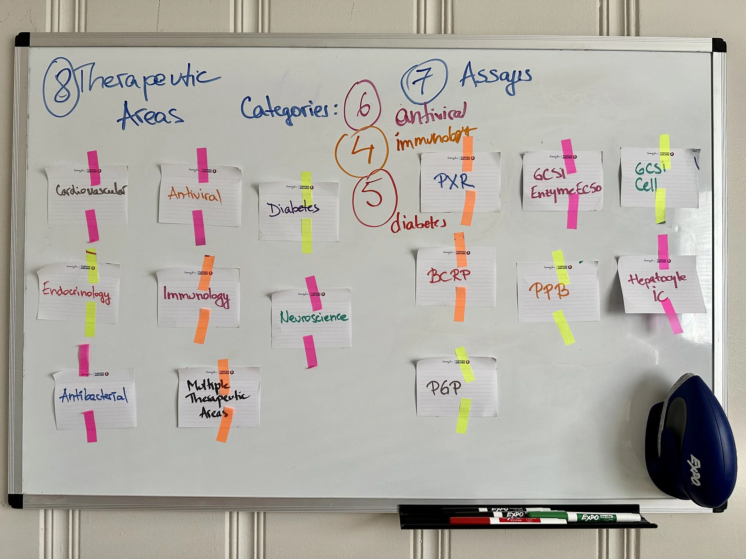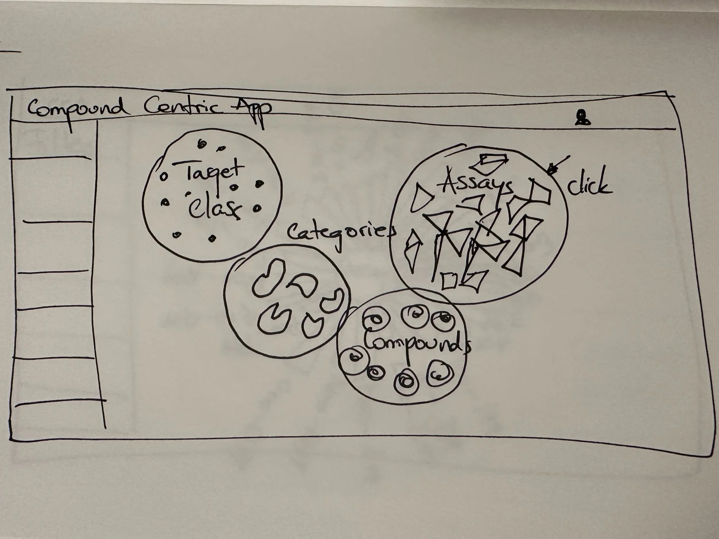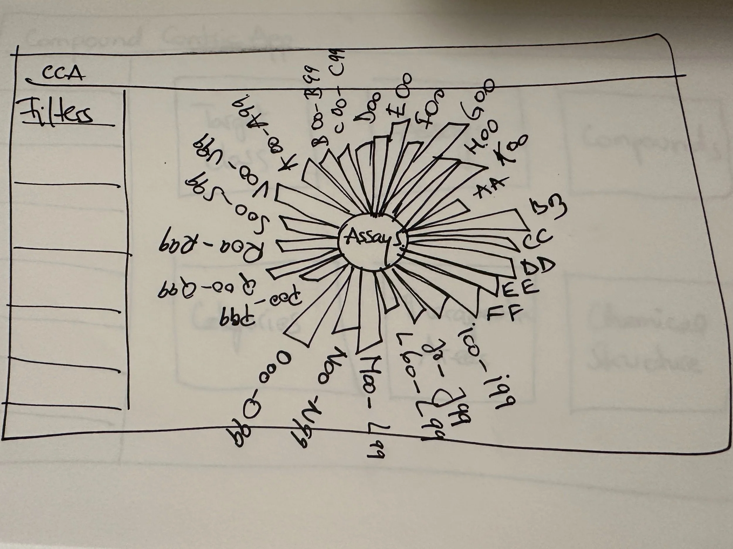 The first thing we did was to brainstorm on a whiteboard what’s the problem and what could be the solution. I love white-boarding because sometimes the best ideas come from whiteboard sketching. What I first did was to write down the Therapeutic Areas and Assays to check if I could categorize the data. One thing about this project was that at this point we weren’t given the real data, just a mock data and looking into the mock data could lead us to design a tool and miss some information. However, we wanted to prove that we can design something useful to scientists. So I looked into grouping this data and trying to find out how many compounds I could visualize in this tool. The maximum number that I came up with was 2,000 compounds. I knew that visualizing more than that would mean making certain compromises.