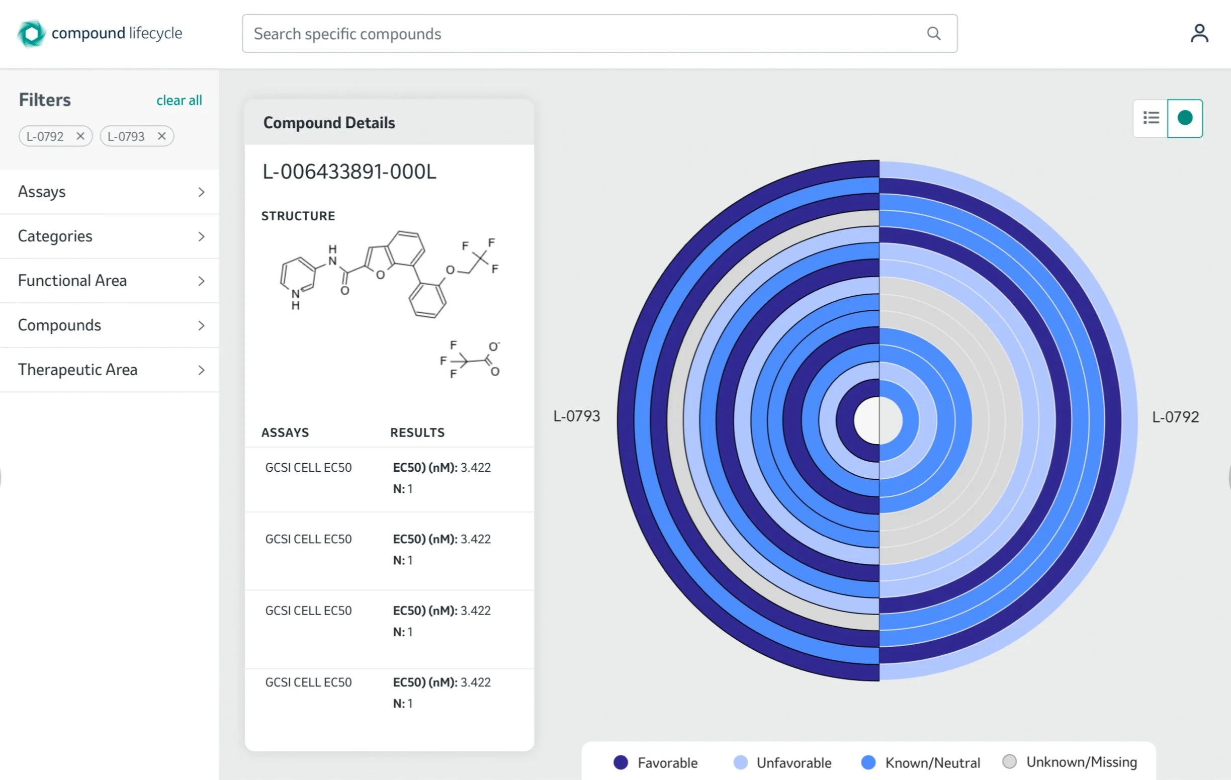 This is the latest version of the app that I designed and prototyped and then handed over to the Engineers to further develop the software. The users can visualize a compound number and how it did through an assay and based on the needs, can filter on the left side the compounds, assays, or categories.