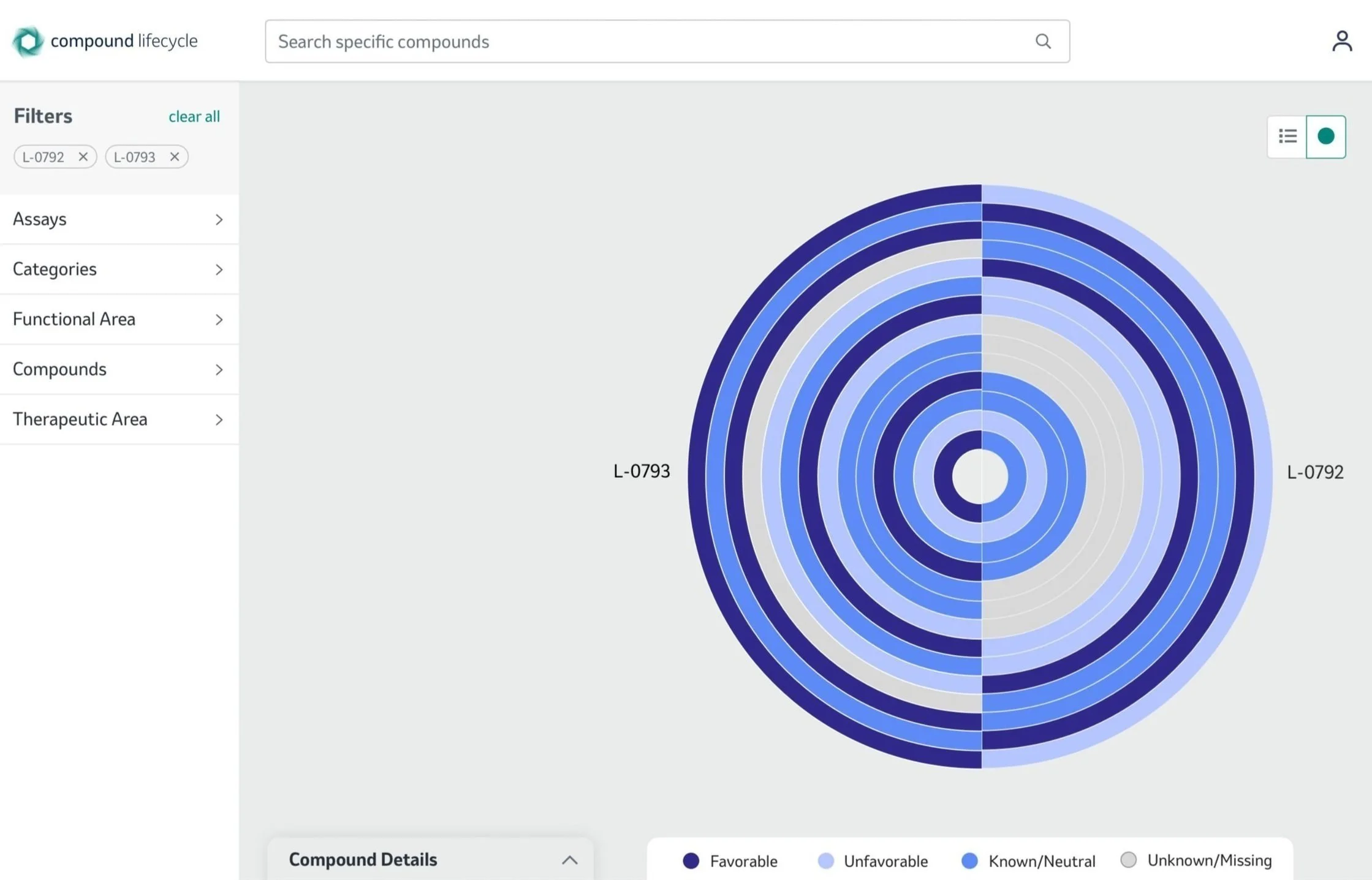 After a few design iterations and continued meetings with scientists, I ended up deciding on this visualization. The data here is represented in a radial bar chart. I iterated this design with the users, the scientists because I believe including the user during the design process is critical. After multiple meetings with them, we agreed upon showing a finite number of compounds in a radial bar chart, and each radial bar represents a compound number.