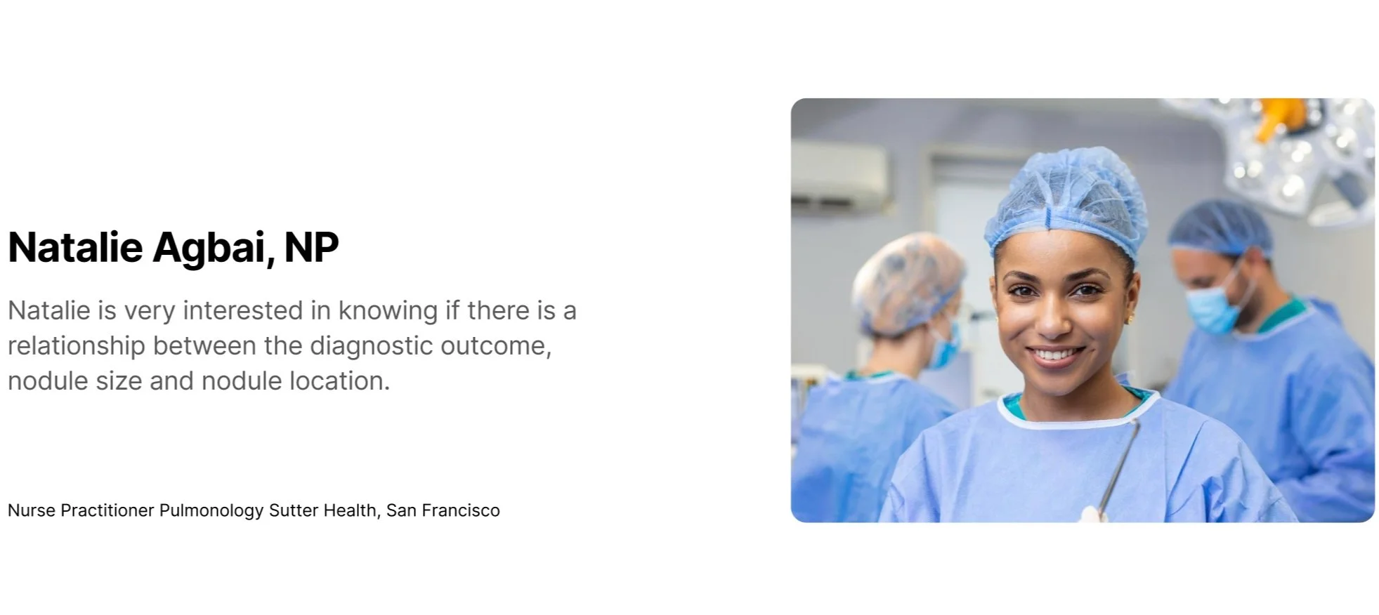 As a pulmonologist, I want to walk away with a diagnosis after each biopsy. For that to happen, I need to get to the accurate location of the lesion, and extract enough samples. Sometimes, I am not able to get to the lesion, or sample enough tissues. My diagnostic outcome is usually lower in smaller lesions in certain lobes of the lung. This may affect my future decisions on which imaging modality to use for these types of lesions.