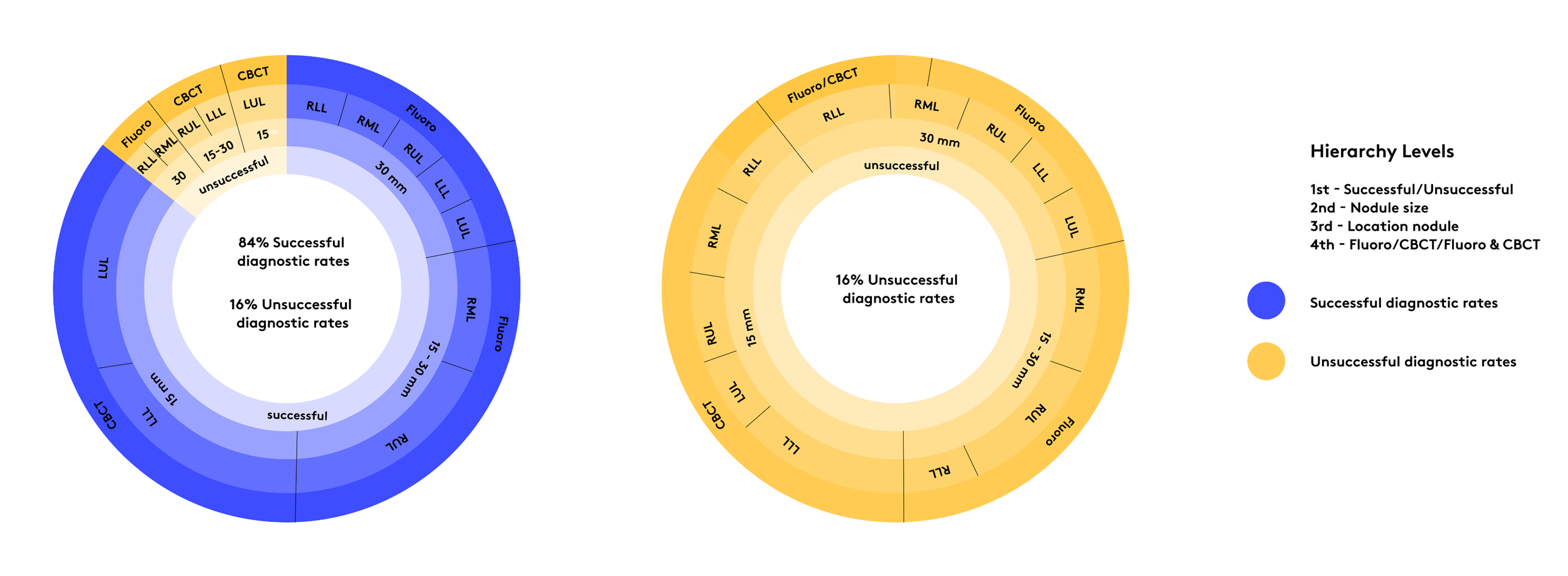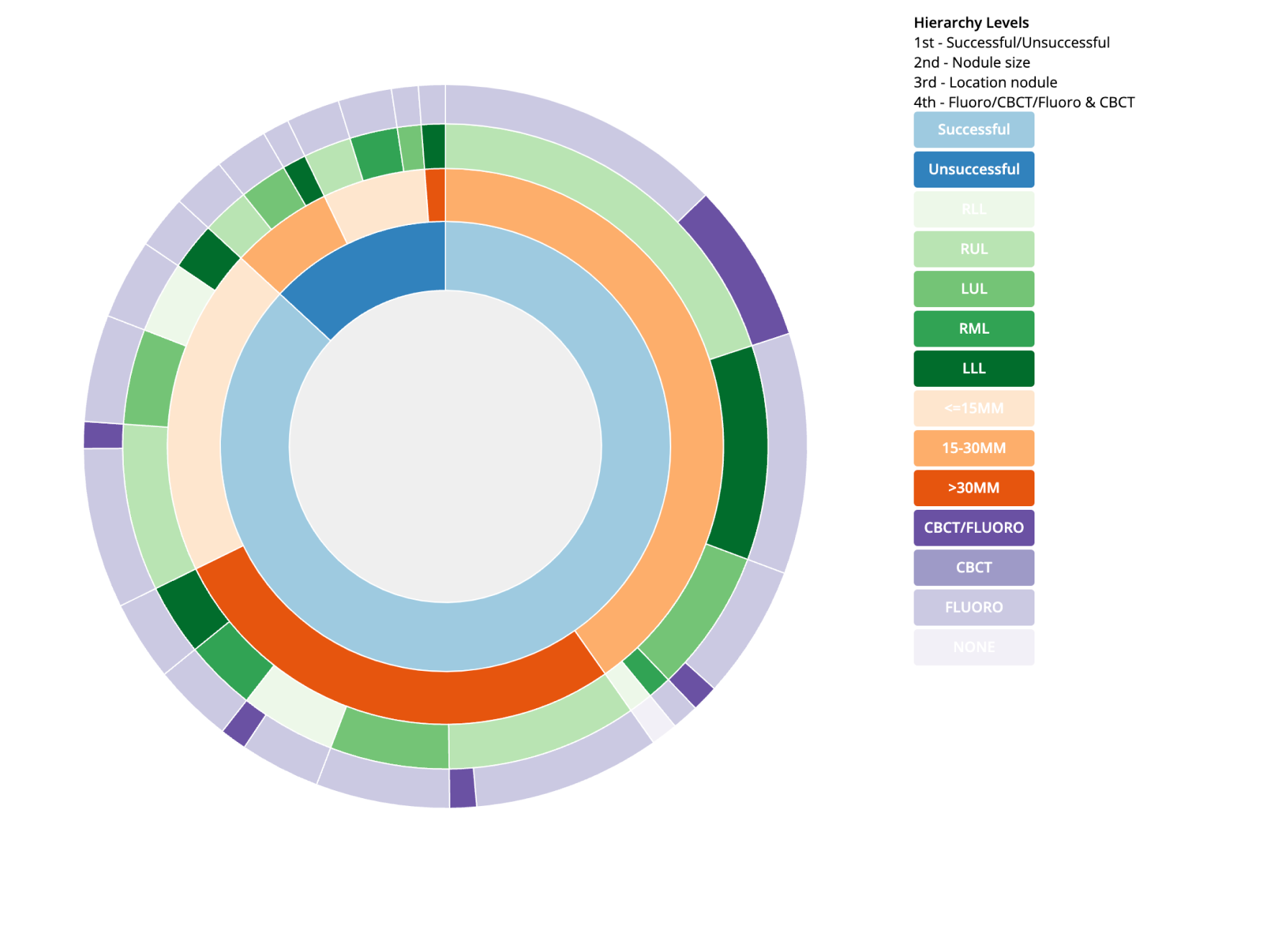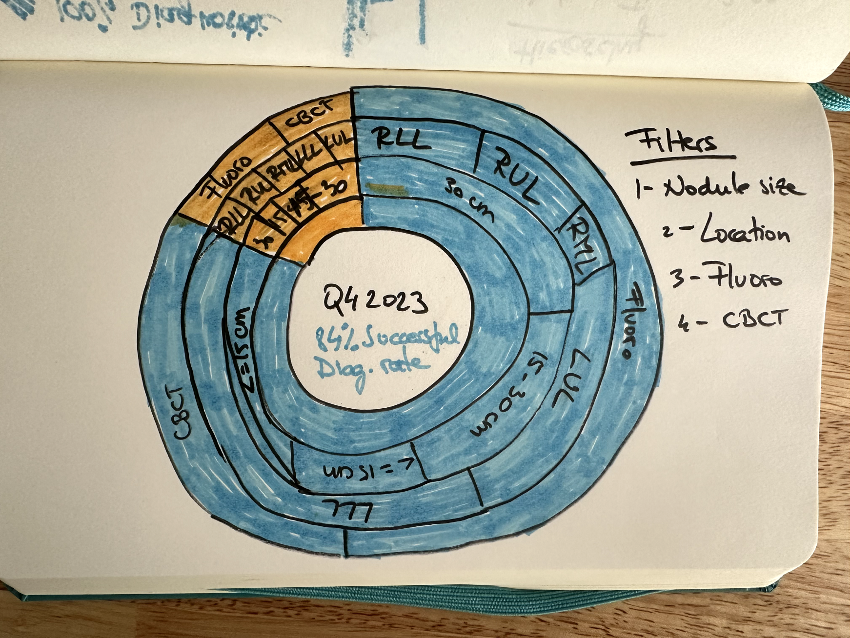 Designing the Diagnostic Outcome Rates in My Intuitive app by prototyping with real user data to show the factors that contribute to a successful outcome rate. This visualization is a overview of the diagnostic outcome for one Physician spanning over 2 years from 5/2021 - 6/2023. It is a POC meant to show patterns in the diagnostic outcome as well as relationships between the diagnostic outcome, nodule size and location.