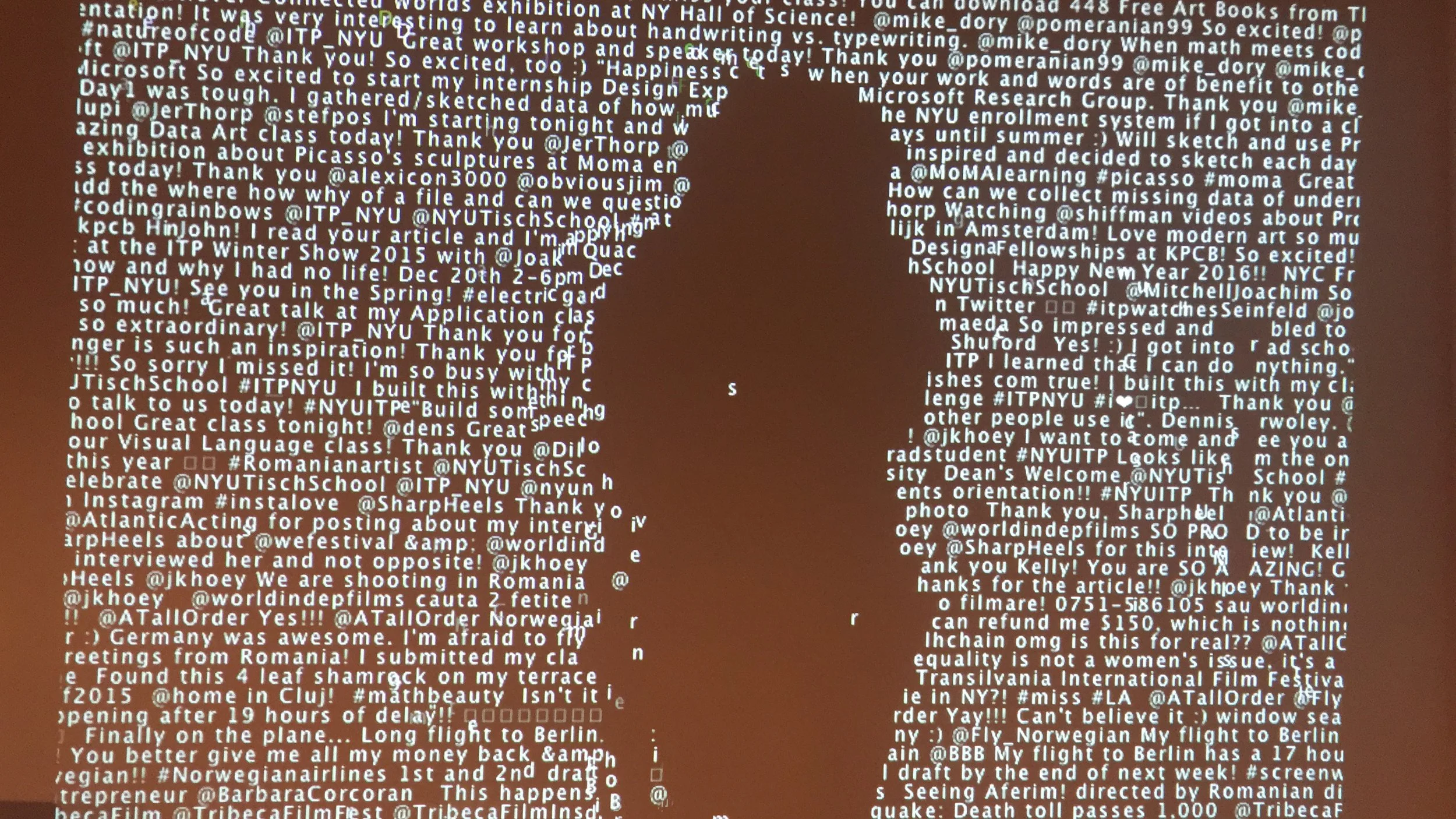 To decide what the text should be was a challenge because on one hand we thought it doesn’t matter and on the other, we realize this could be seen as someone’s identity mirror. The installation displays tweets from the user and projects them on the wall. The user can interact with the text through a Kinect. Each user can put in their twitter username in order to get their own ‘personalized’ portrait.
